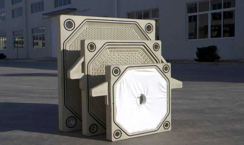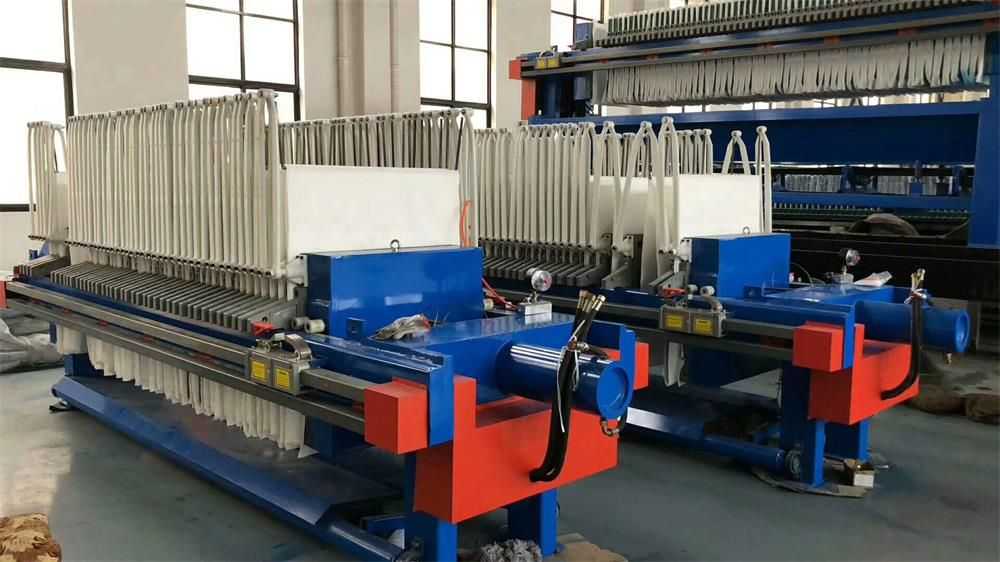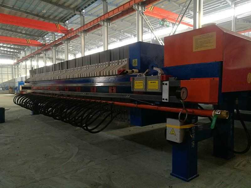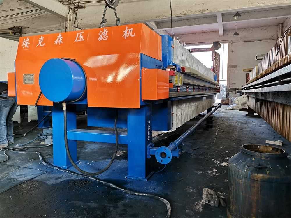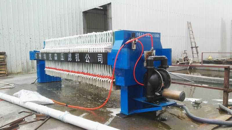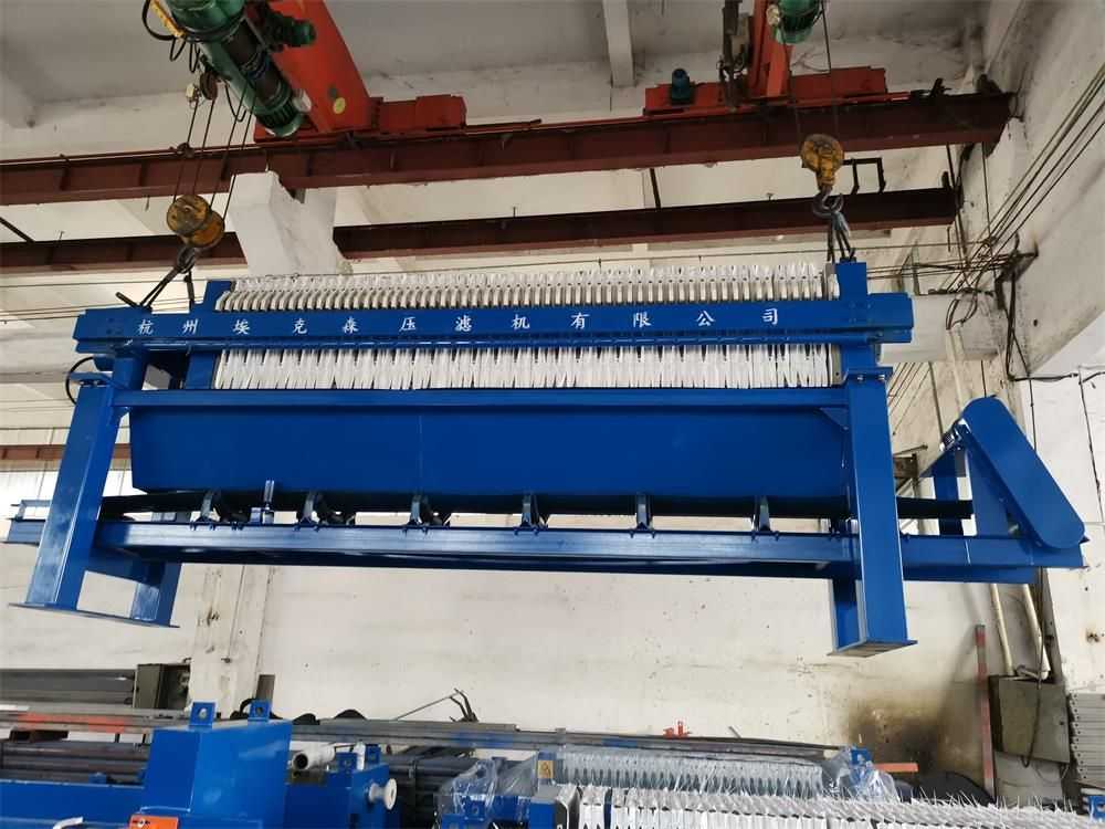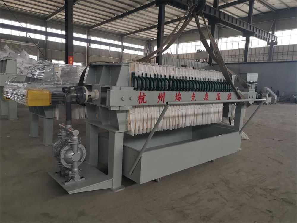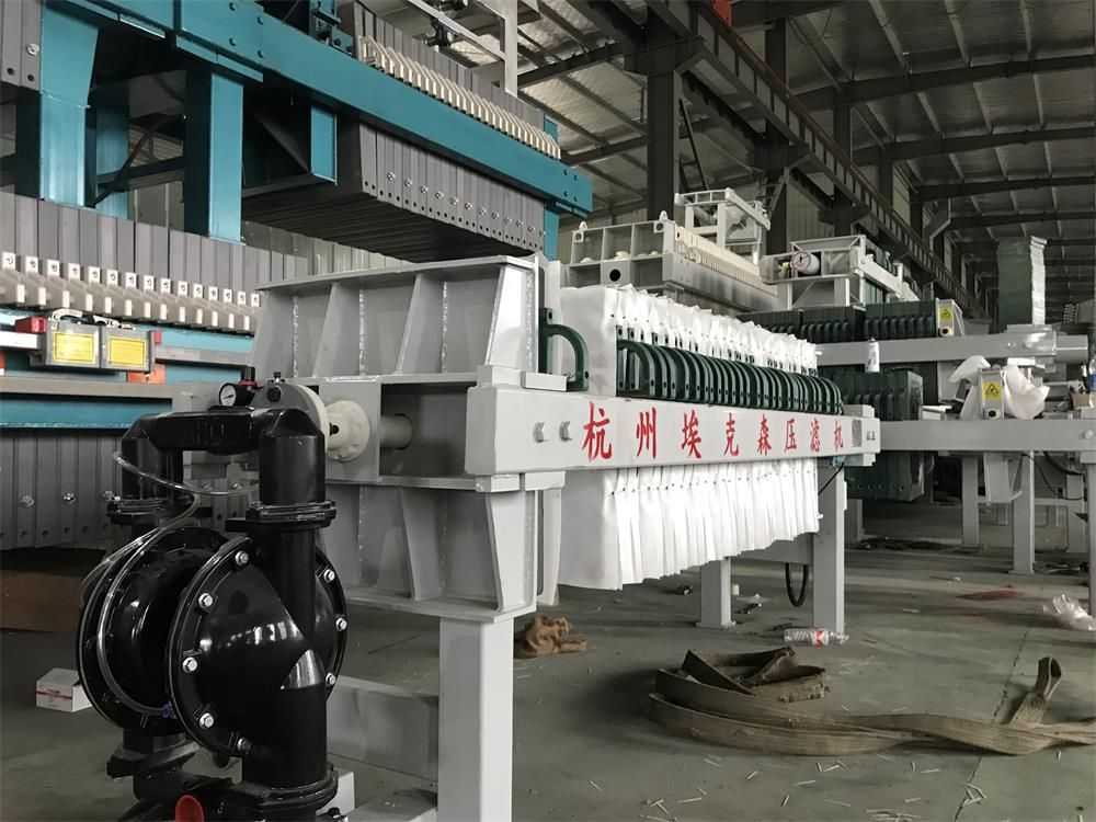 隔膜壓榨壓濾機是由隔膜板和廂式濾板排列組成濾室,在輸料泵的壓力作用下將料漿輸入濾室,通過過濾介質(zhì)(濾布)將料漿中的固體和液體分離,當料漿中的固體形成餅后,再向隔膜通入空氣,對濾室內(nèi)的固體充分壓榨。